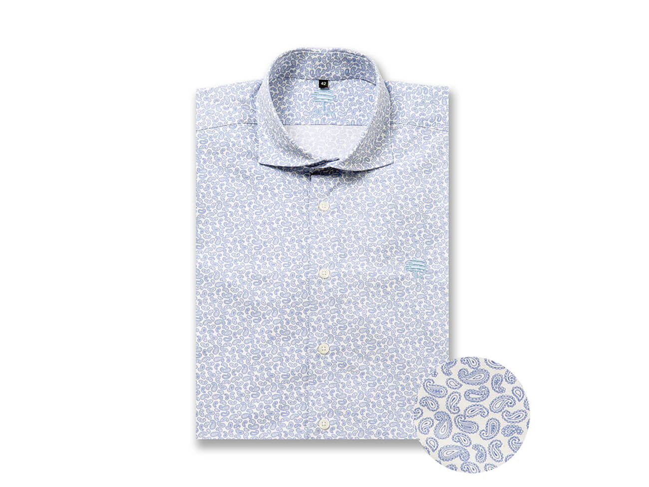 Hellblaues Paisleymuster auf weißem Untergrund. Aufgrund der Zweifarbigkeit wirkt es nicht zu „wild“ und ist somit das perfekte Einsteigermodell für mutige Musterträger.